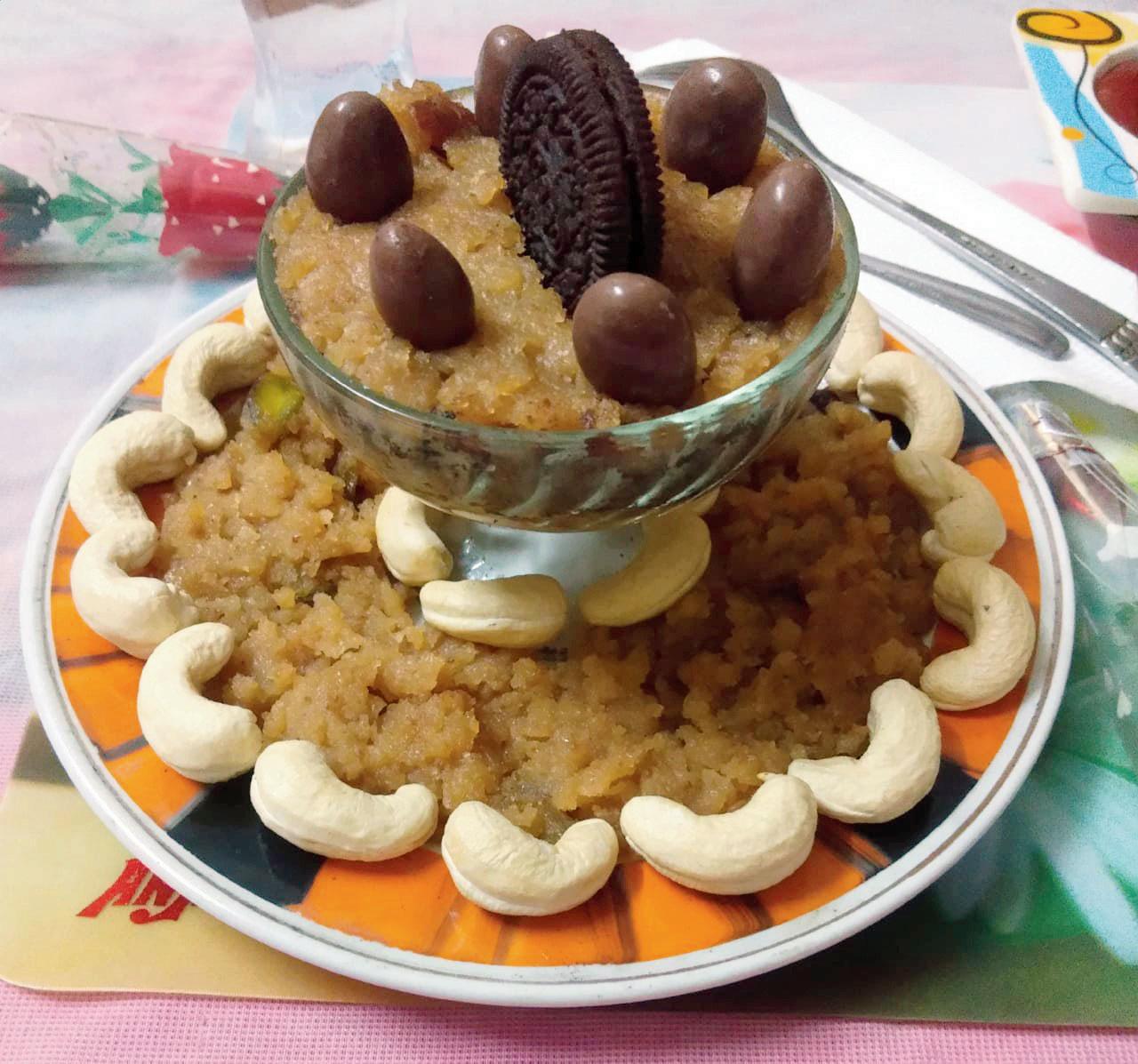 ડેકોરેશન અને વેરિએશન : એક બાઉલમાં પહેલાં શીરો પાથરવો. એના પર ઓરિયો બિસ્કિટનો ભૂકો પાથરી ઉપર ફરી શીરો પાથરવો. ઉપર ચૉકલેટ અને ડ્રાયફ્રૂટ્સથી ડેકોરેટ કરવું.